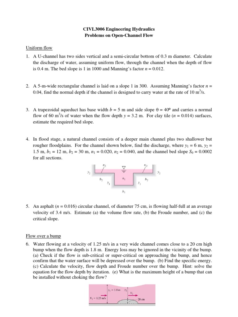 File Type PDF Open Channel Hydraulics Book Solved Problems Equations of Motion for One-dimensional Unsteady Flow in Open Channels and Through Control Structures Hydraulics of. EXERCISE PROBLEMS OPEN CHANNEL FLOWS 1 A rectangular irrigation channel of base width 1 m is to convey 02 m3s discharge at a depth of 05 m under uniform flow conditions. Open-channel-hydraulic-solved-problems-pdf 11 map index pdf Open Channel Hydraulic Solved Problems Pdf Thank you unconditionally much for downloading open channel hydraulic solved.